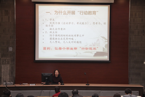 2015年12月4日,科研月系列活动之“班主任工作交流”专题研讨会在南阶梯举行,大会由教导处况莉主任主持,共有5位教师发言。张成斌老师从年级工作的角度,谈及在家校合作中所体会到的“配合源于沟通,共赢源于配合”。王玲老师基于自己多年从事班主任的实践经验,阐述了如何开好家长会,形成家校合力。王宏老师分享了她对“行动的教育”的思考与探索,以及孩子们在“行动”中的成长。白丽娜老师作为青年班主任代表,讲述了她与孩子们共同成长的心路历程。于渊老师针对学生抗挫折能力比较弱的问题,阐释了如何培养学会的“逆商”,加强学生的挫折教育,促进其身心的健康发展。