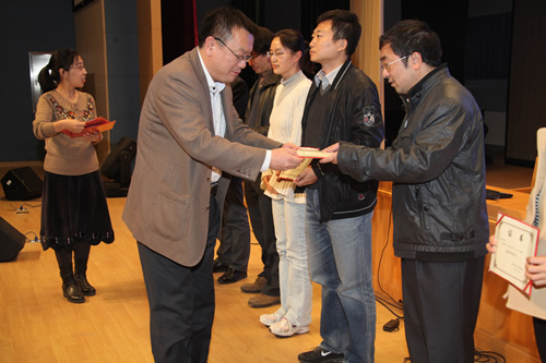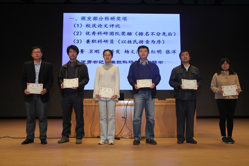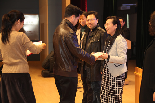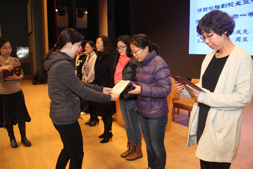 上半场,冯主任首先公布了本年度论文评选结果。此次共评出一等奖8篇,二等奖31篇,三等奖51篇,鼓励奖32篇。顾咏梅副校长宣读了获奖名单,王莉萍校长为获得一等奖的教师颁发了证书。随后梁原草副校长为本学年度的八个优秀教学研究团队颁奖,许建勇书记为学校“十三五”课题所聘请的兼职科研员老师颁发了聘书。