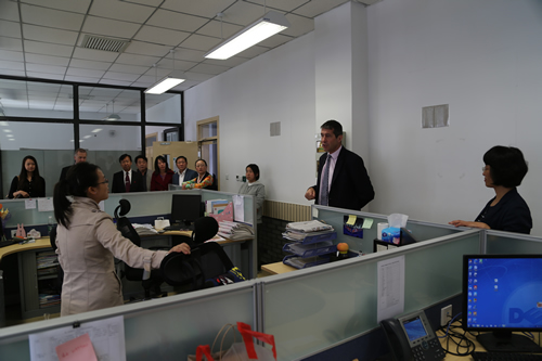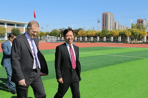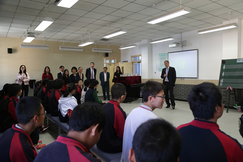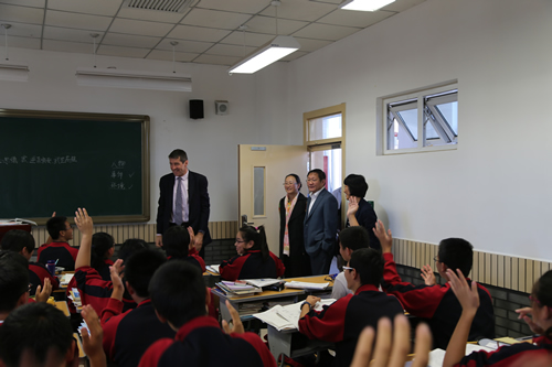 中午时分,总裁一行到访kaiyun网页登陆入口 平谷第一分校。平谷区教委主任李学东、副主任徐皝会见来宾,kaiyun网页登陆入口 副校长李敏、平谷一分校执行校长李磊、副校长董长华、副校长刘莉娟陪同会见来宾。Mr. Mark Stanton和Mr. Stuart White走进一分校的语文和音乐课堂,并与师生展开亲切互动。Mr. Mark Stanton还与在校交流的美国留学生针对跨文化学习展开简短讨论。此外,他们参观了学校的生物实验室、电脑机房、操场、食堂及学生宿舍,对设备的配置、使用及维护给予了高度认可。当看到平谷一分校在建校初期获得诸多国家级、市级、区级荣誉时,来宾们深表赞叹。