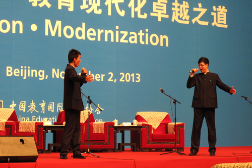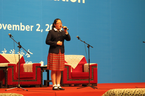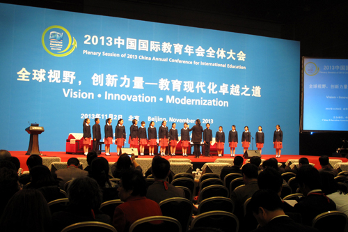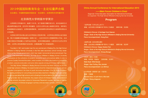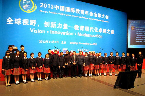 2013年11月2日,以“全球视野,创新力量——教育现代化卓越之道”为主题,2013中国国际教育年会在中国国际会议中心举行。应大会组委会的邀请,我校“附中人”合唱团和中央音乐学院附中乐团为全体大会表演。我校合唱团的同学们演出了小合唱《马车从天上来了》 、《欢乐的那达慕》 ,男声二重唱《鸿雁》 和女高音独唱《军营里飞来一只百灵》 。同学们的精彩表演和良好素质,得到与会国内外教育专家的充分肯定,并报以热烈的掌声。出席本次国际教育年会的刘沪校长观看了表演,并和我校师生合影。(艺术组)