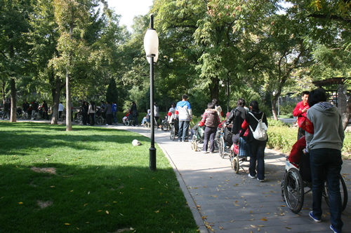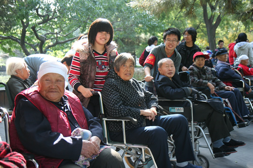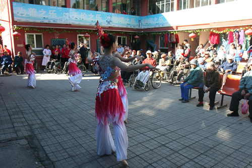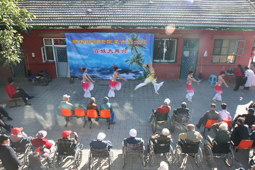 一大早,我校青杉舞蹈队的5名小演员和高一4班36名同学来到颐寿轩敬老院义务服务。傣族舞蹈《鱼儿》是我校舞蹈老师齐峰创编的,悠扬的曲调特别适合表演给老人观看,小演员的完美演绎受到热烈欢迎,敬老院里响起了久久不息的掌声,时间仿佛也在这温馨感人的画面中凝固。之后,在敬老院史院长和护工们的陪同下,同学们小心翼翼地推着轮椅,带上老人们去宣武公园欣赏深秋的美景。