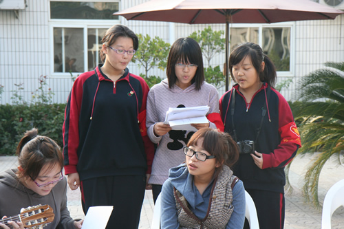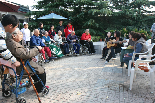 下午,高一年级10位志愿者负责人来到位于昌平区天通西苑的朝阳门医院临终关怀病区。刚好有中央音乐学院的几位大学生义工正在院子里弹唱老歌,与老人们联欢,同学们踊跃地加入了表演的队伍,《在那遥远的地方》、《我的祖国》、《南泥湾》、京剧《智斗》、……,暖暖的午后,老人们也引吭高歌。联欢会后,同学们陪着老人聊天慰藉他们孤寂的心,亲手剥香蕉喂老人吃,老人们都十分激动,有的老人还嘱咐孩子们好好学习,一定要成为祖国的栋梁之才。
