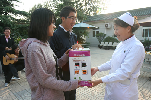 2010年10月16日,恰逢九九重阳节。带着节日的美好祝愿,kaiyun网页登陆入口 2批学生志愿者先后走进敬老院和临终关怀医院看望生活在那里的老人,并带上用“小天使”基金购买的按摩垫给老人,为他们送上浓浓的节日祝福。