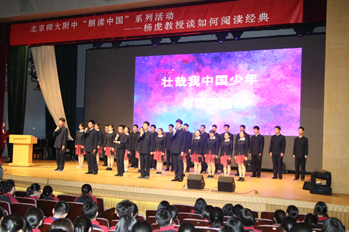 3月25日下午,校学生会举办的“朗读中国 传习经典”系列活动在附中百年会堂举行了别开生面的启动仪式。北京大学继续教育学院副院长、副书记,新闻与传播学院现代出版研究所特聘研究员杨虎老师以其精彩的讲座《经典的选择与阅读之法》为“朗读中国 传习经典”活动拉开帷幕。