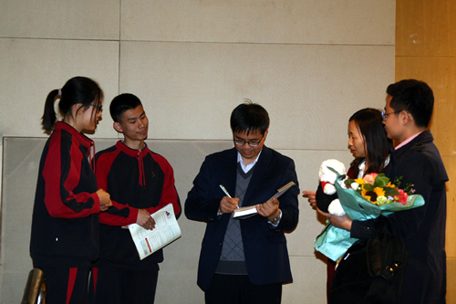 杨虎老师旁征博引、妙语连珠,从为何读书、应读何书、何谓经典、经典的阅读之法等四个方面,为师生们做了精彩生动的讲解。在杨虎老师结合现实生活、深入浅出的讲解下,同学们感受到经典不再是那些晦涩难懂的古文,那传唱千古的《诗经》是如此的优美雅致,作为儒家经典的《论语》是如此的平易近人。经典是承载着人类文化基因,让人与光明、美好更加接近的精神宝库。杨老师特别指出有知识不等于有文化,而一个人的文化和智慧是要靠系统深入广泛地阅读经典获得的,远非看手机、Ipad获取信息可比。他倡导大家放下手机、重归经典,并当场示范朗读了韩愈的《马说》,向高二年级各班赠送了他主编的《未名湖畔好读书》一书。